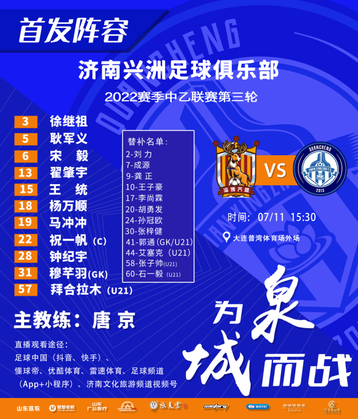 首发阵容:3-徐继祖、5-耿军义、6-宋毅、13-翟肇宇、19-马冲冲、22-祝一帆(C)、31-穆芊羽(GK)、57-拜合拉木·阿卜杜外力(U21)、15-王统、18-杨万顺、28-钟纪宇。替补:2-刘力、9-龚正、7-成源、17-李尚霖、24-孙冠欧、30-张梓健、41-郭通(GK/U21)、44-艾塞克(U21)、60-石一毅(U21)、58-张子帅(U21)、10-王子豪、20-胡勇发。