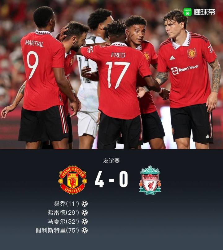 北京时间7月12日21:00,曼联与利物浦在泰国曼谷进行一场季前友谊赛。上半场,桑乔低射首开记录,弗雷德写意吊射破网,马夏尔断球一条龙建功;法比奥-卡瓦略、路易斯-迪亚斯与达洛特先后中框,利物浦连换十人。下半场,佩利斯特里替补建功,萨拉赫两度中柱,努涅斯首秀失空门。最终,曼联4-0大胜利物浦。