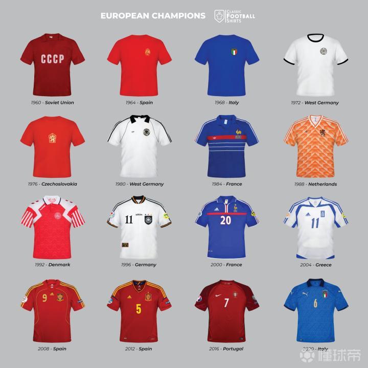 历年欧洲杯冠军球衣。