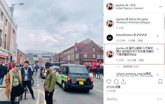 因为很少看足球的原因,周杰伦也多次被球迷称为“球盲”和“伪球迷”。2019年5月8日,周杰伦就和老婆昆凌及一众好友来到安菲尔德,见证了欧冠利物浦4-0大胜巴塞罗那的史诗级逆转。因为没有提前预订球票,只能坐在较后的位置。赛后,周杰伦在社媒上就发问:“谁可以解答?今天角球踢出,对方(巴萨)为何来不及反应,我真的不是很懂足球”。随后还发出两个调皮的表情。