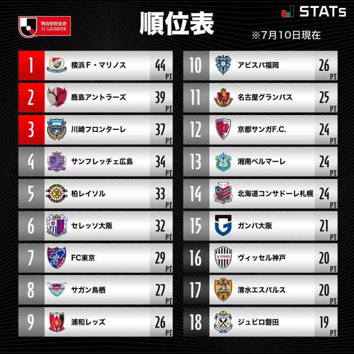 北京时间7月10日,2022赛季J1联赛第21轮的较量全部结束。大阪樱花主场2-2终结横滨水手六连胜,莱奥-塞阿拉双响+补时绝平;川崎前锋主场4-0大胜十人大阪钢巴,马尔西尼奥传射;神户胜利船客场1-0击败磐田喜悦,取得联赛三连胜,暂时升至倒数第三;浦和红钻主场3-0击败FC东京,西川周作打破J1零封场次纪录。