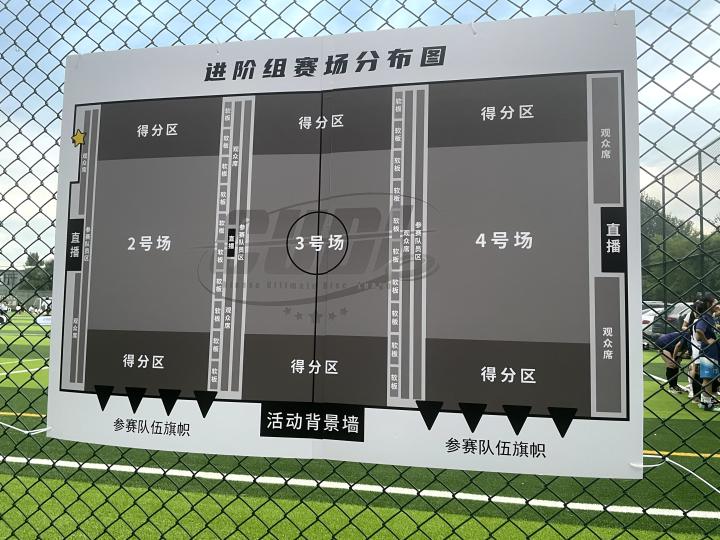 一块专业的11人制足球场被一个(100X37米)的区域和三个(70X28米)的区域划分出了两个极限飞盘的比赛场地,10个队伍捉对厮杀,这小两百号人聚集在足球场只为了一项时下最热门的新鲜运动而来——极限飞盘。