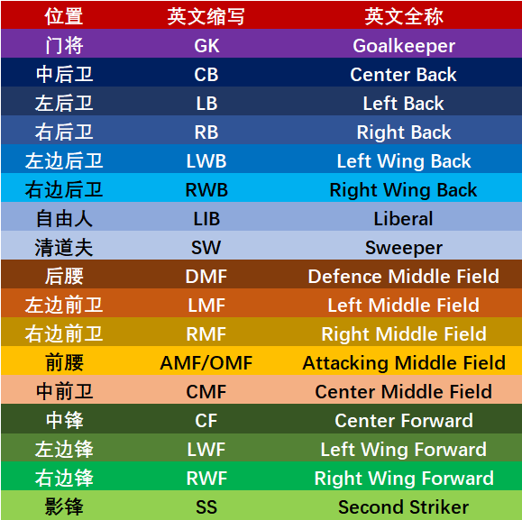 足球阵型中各个位置的中英文对照