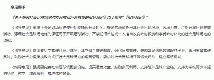另外在国家体育总局与国家发改委联合印发的《关于加强社会足球场地对外开放和运营管理的指导意见》中说明了,社会足球场地优先保证用于开展足球活动,严禁任何单位或个人擅自改变政府投资和享受政府补助的社会足球场地的功能。