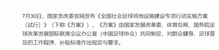 在国家发改委发布的《全国社会足球场地设施建设专项方案(试行)》中明确提到了,对群众健身,足球普及的工作程序、补贴标准作出规定与要求,注意这里是把群众健身和足球普及是放在并列句中,是同等高度,也就是说只要是符合群众健身的项目同样也在这个工作程序和贴补标准中。