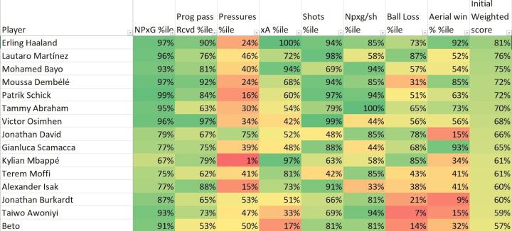 如果有人说排在第一的哈兰德正是曼联需要的那个类型(奥莱两年前肯定是这么想的),那就说明我们的思路没错。接下来我再滤掉那些目前不可能加盟曼联(比如哈兰德)以及不踢中锋(比如特雷姆-莫菲)的球员。
