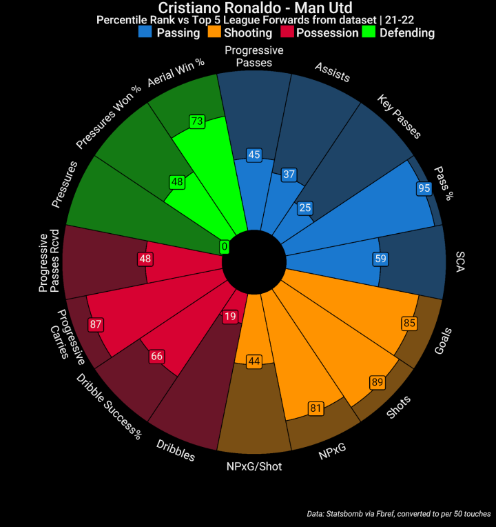 虽然C罗的进球数据很漂亮,但他也存在不少拖累了球队的问题。最大的问题则是逼抢。他在“压迫”这项数据上的百分位数为0,是我筛选出的数据集里最差的一位。他的压迫成功率也只是一般水平。传球数据表明C罗在比赛中的创造力不足以助攻队友,传球到位率是唯一的积极因素。C罗在“NpxG/Shot”和“接应推进传球”这两方面的表现都只是平均水准,说明他在门前威胁区域接应队友传球的中锋跑动这方面做得不够好,他经常靠向左路或回撤,还尝试了不少机会并不好的远射。