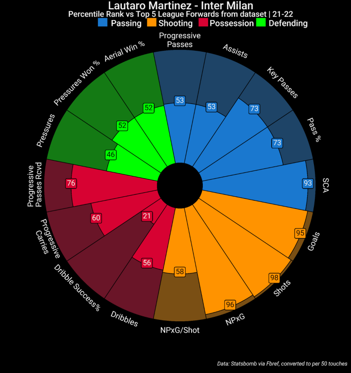 优势:劳塔罗或许是同年龄段表现最全面的前锋,他拥有出色的射门技术,得分威胁位居榜单前列。劳塔罗终结表现如此出色的原因之一就是他的专注度和稳定性。他很少错失机会,也时刻清楚场上是什么情况。劳塔罗会选择“准确性优于力道”的射门方式,回撤后也擅长创造射门机会以及保有控球权。劳塔罗能背身拿球,用简洁的一脚出球或隐蔽性传球分给队友。每逢进攻阶段,劳塔罗总能看到合适的跑动线路,为队友提供出球选项,给自己创造射门机会。他的速度足够快,也擅长在狭小空间内闪转腾挪。如果不是跟位置更靠前的锋线搭档,他的“NpxG/Shot”和“接应推进传球”这两项数据还会更亮眼。不论是快速反击还是破大巴,劳塔罗都能提供优秀的跑位,总能在合适的时机出现在合适的区域撕开对方防线,为队友或自己创造机会。他还具备空中优势,用头球攻门成功转化许多得分良机,也有能力摆渡给队友,“争顶成功率”看上去不高的主要原因是争顶次数很多。