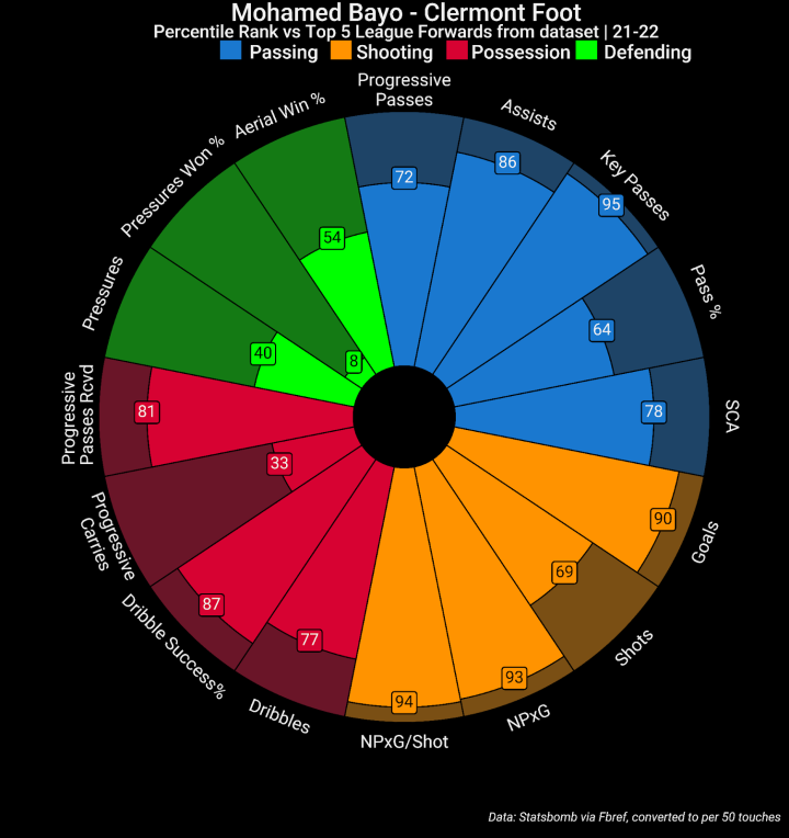 我能保证,没人会猜到克莱蒙中锋巴约会入围本文的候选名单。没猜到也没关系。直至2021年,巴约还在征战法国的第二级别联赛。作为克莱蒙的青训产品,巴约直到22岁都还在通过预备队比赛和外租来积攒经验。2020-21赛季,巴约终于锁定首发位置,用22球7助攻帮助球队升上法甲。到了2021-22赛季,他延续了自己的良好状态,27次首发贡献14球5助攻,帮助球队保级成功。这样的表现让巴约在今夏引起了众多欧洲俱乐部的注意。有传闻称埃弗顿将其视作理查利森的接替候选之一,西汉姆也在考虑引进他给安东尼奥带来竞争,但最新报道称里尔已经冲到领跑位置。