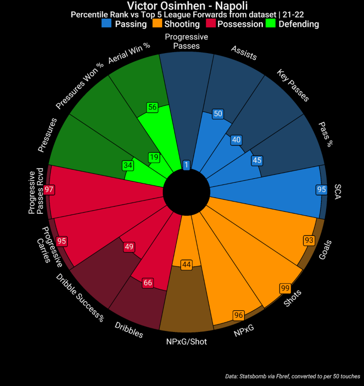 优势:奥斯梅恩可能是这份候选名单中身体素质最好的一位。他的身高、力量、速度、敏捷性和体能构成了一个较为罕见的集合体。这就使得奥斯梅恩总能获得球权(比如高高跃起,突然启动在场上飞奔,或是在对方禁区内远程冲刺),他总能出现在合适位置,轻松地靠身体对抗或速度胜过对手。他的加速和跑动速度能让他从容地通过急停急起或变向让防守人晕头转向,面对防守人时也能凭借自己的力量优势完成强力带球。奥斯梅恩的背身和精细控球同样出色,这得益于他的身体素质和脚下技术。和卢卡库类似,奥斯梅恩能轻松扛住后卫,护住皮球后分给队友。他的高球商跑动正是“接应推进传球”数据如此吸引人的原因。除了惯用脚右脚,奥斯梅恩用左脚和头顶完成终结的能力也不容小觑。