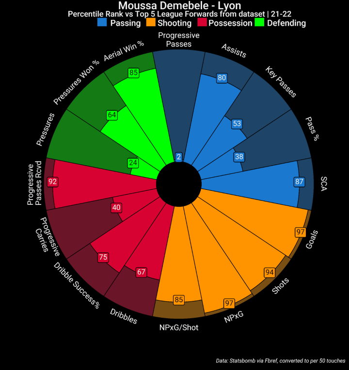 弱点:穆萨面向对方球门时的威胁最大。如果是背身拿球,穆萨的进攻威胁就小多了,在拥挤区域内受压也容易丢失球权。不论是传球还是带球,穆萨在推进球权这方面都做得不理想,精细控球也不算太保险。当里昂中场拥有费基尔和恩东贝莱这类能稳定提供弹药的球员时,穆萨可以大放异彩,但两人离队加上里昂锋线冒出了埃坎比和卡德维尔这类无球跑动不错的球员,穆萨的许多优点就显得有些鸡肋了,所以也经常被教练组弃用。穆萨最终还是赢回了首发位置,但必须留意的是,他取得成功的基础是跑位,以及球队充分支持以便最大化他的优点。考虑到曼联想引进埃里克森和德容来帮助桑乔和布鲁诺,创造力都有些溢出了,再招募来穆萨这个类型的前锋也有一定吸引力,但确定第二个中锋选项,提供穆萨办不到的贡献(也许是马夏尔?)也需要纳入考虑。