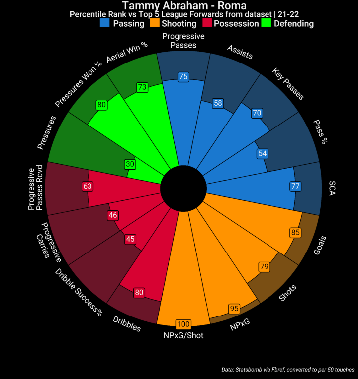 优势:亚伯拉罕的进球表现是世界级的。早在转会到罗马之前,他每90分钟内的“进球”、“NpxG”和“NpxG/Shot”等数据就已经非常亮眼了。刚刚过去的这个赛季里,他得到了一个完整赛季的时间将这些数据提升至顶级水平。亚伯拉罕的射门质量一直都是标杆,“NpxG”在我们的数据集中名列前茅。这说明他能跑到不错的位置上,近距离完成高质量的射门。亚伯拉罕拥有出色的跑动和位置感,不论是从对方后卫之间冲入禁区,跑到落点接应队友传球,还是在转换进攻中选择合适的空当,他总能为球队贡献目的性明确的跑动。亚伯拉罕有20%的接应传球在对方禁区内完成,禁区内触球的48%会以射门告终。这组数据足以证明他在禁区内的杀伤力。尽管创造力一般,亚伯拉罕还可以背身扛住防守人然后快速出球交给前插的队友。如果前方有空当,他也有能力在反击中给边锋送上传球,推进传球的功力比外界预想的更好。在防守阶段,亚伯拉罕会勤奋地回防,封堵对方的传球路线,这是他在穆里尼奥麾下悉心学习的成果。
