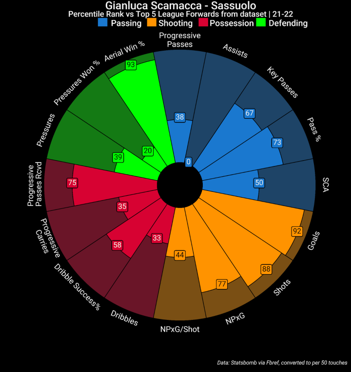 弱点:出色的射术以及什么都想做的意愿会让斯卡马卡做出一些糟糕的射门选择,尤其是远射。你经常能看到他在本可以做出更好选择的情况下直接尝试一脚威胁有限的远射。这就是他“NPxG/Shot”数据低于平均的原因。斯卡马卡的抢点意识比起候选名单上的其他人稍逊一筹。上赛季是他职业生涯首次单赛季联赛进球数上双,有时候你也会觉得他的比赛呈现过于全面,活动范围大过头了,对于一家希望得到有机会竞争金靴的稳定得分点的俱乐部来说,这样的比赛履历反而算不上理想。