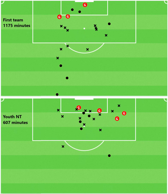 下面的示意图显示了他在一线队和青年国家队的射门位置。在高级别的足球比赛中,他进入了有威胁的得分位置,也尝试了更多的投篮射门,但是在国家队,他在六码禁区附近的更远的区域射门很多,也展示了他从右边切入并射门的素质。