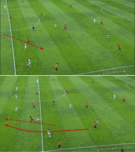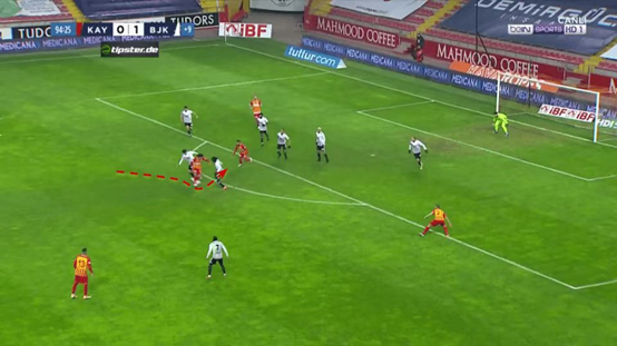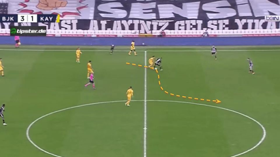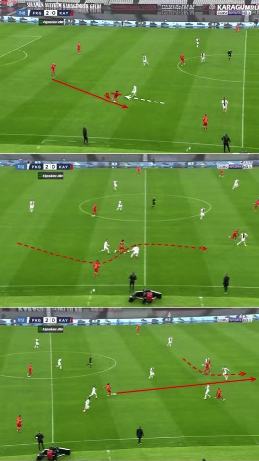 在下面的例子中,我们看到德米尔利用对手缺乏紧凑的优势打破了他的跑动,进入了最后进攻三区的位置。他首先从中后卫那里接球,然后让球越过他,同时用微妙的假动作将紧迫的对手以错误的方式躲避出去。然后他设法以简单而优雅的动作以良好的速度越过两个对手,然后几乎从中场助攻到他的队友。