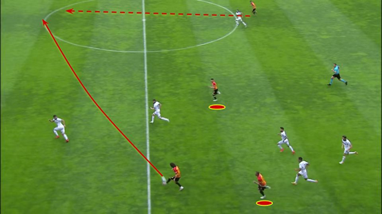 下面的例子是一个有趣的例子。在攻击过渡中,德米尔有两个不错的短传选择,但他抬起头,发现他的队友跑在球场的另一边,这可能会直接创造一个机会,只要一个传球就可以打通这条通道。然后,他相信自己的技术,并长传传给队友。
