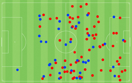 在上面的示意图中,我们看到了德米尔与一线队的进攻对抗和运球。很明显,他的成功率还不够高,他发现在更深的位置对抗时很难保住球。