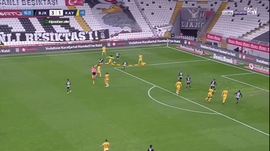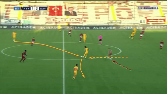 在下面的图片中,德米尔在中线后面,从防守线接球。当他移动时,一个对手离开了他的位置来防守他,但是德米尔只需要用他左脚的外侧一敲就可以对他的队友进行完美的过人配合,德米尔吸引了防守队员后他就自由了。