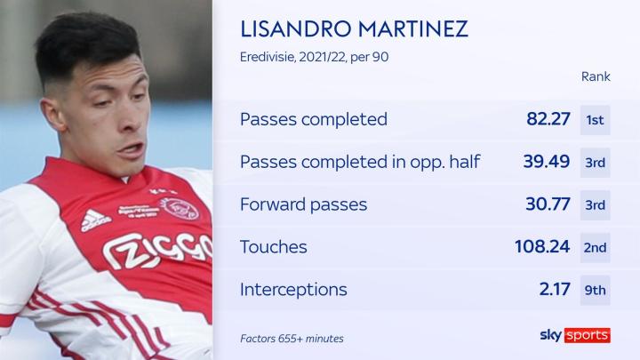 上赛季在阿贾克斯,马丁内斯的头球解围次数(29)高居第一,112次空中对抗赢下了79次,其71%的成功率与曼联和阿森纳的现有中卫比较仅次于马奎尔一人。