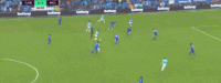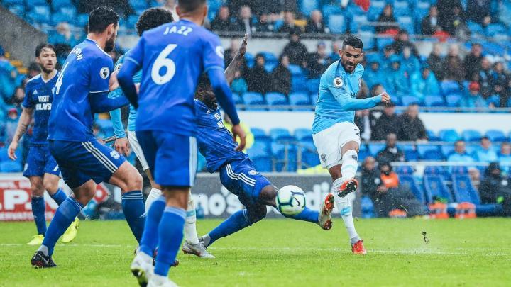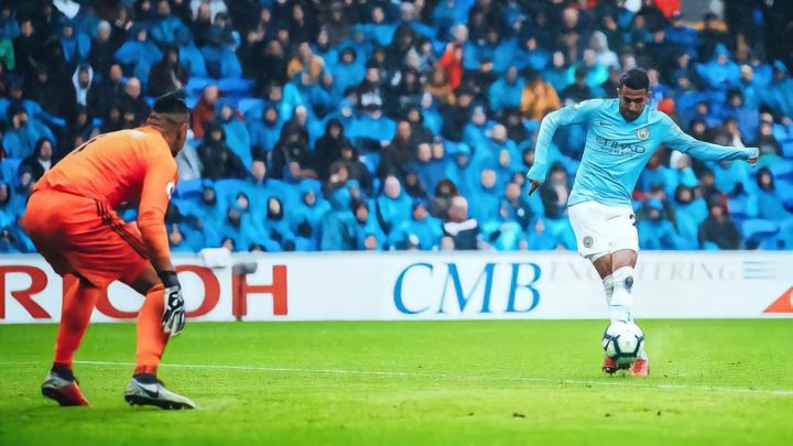 (2018/19赛季第6轮,曼城5:0加迪夫城,比赛第89分钟,萨内带球长驱直入,随后传球给斯特林,但是被卡迪夫城后卫抢断,但是他的传球又再次被马赫雷斯抢断,阿尔及利亚中场虚晃过后左脚劲射破网梅开二度)
