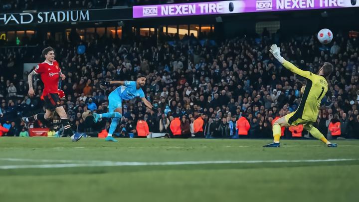 (2021/22赛季英超第38轮,曼城4:1曼联,比赛第90分钟,马赫雷斯打脸德赫亚破门)