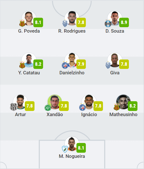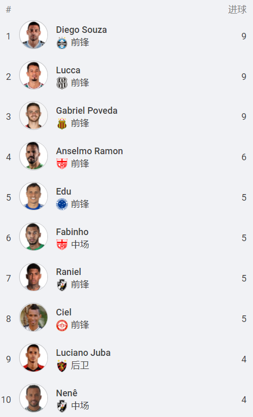 18轮战罢,格雷米奥中锋索萨、庞特普雷塔前锋卢卡、森柏欧前锋波韦达以9粒进球位列三甲。