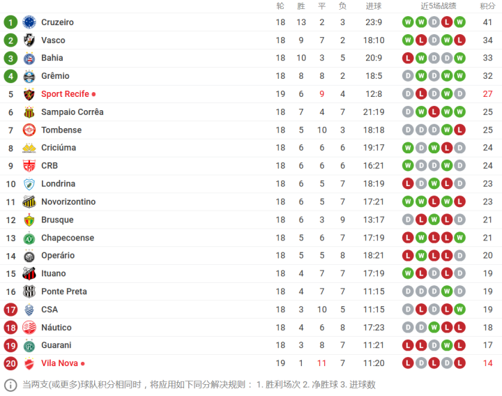 18轮战罢,克鲁塞罗积41分继续领跑;瓦斯科达伽马、巴伊亚、格雷米奥分列2-4位。积分榜后段,维拉诺瓦积14分垫底。