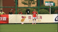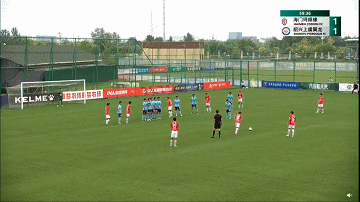 第67分钟,18号潘驰在对方禁区右侧发出任意球,19号郑磊鱼跃攻门被对方门将托出底线。