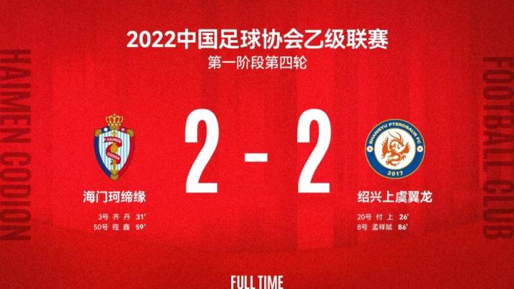 战报—齐丹、程鑫破门 珂缔缘2:2绍兴 遗憾收获平局!