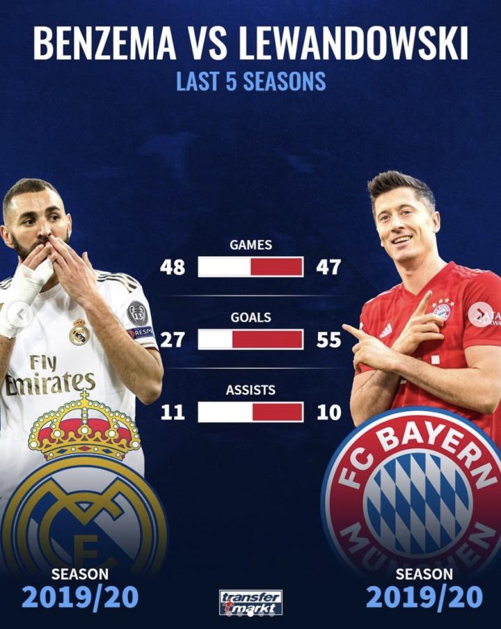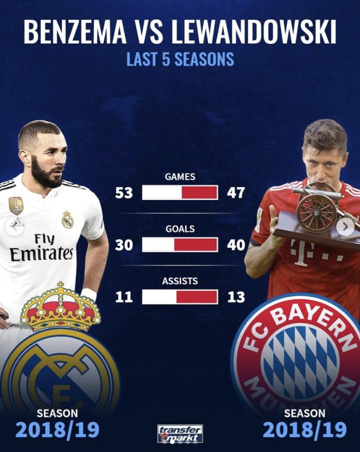巴萨官方确认莱万将加盟球队,新赛季西甲莱万PK本泽马的对决看点十足,德国转会市场对比了这两名前锋过去五个赛季的进球助攻数据。