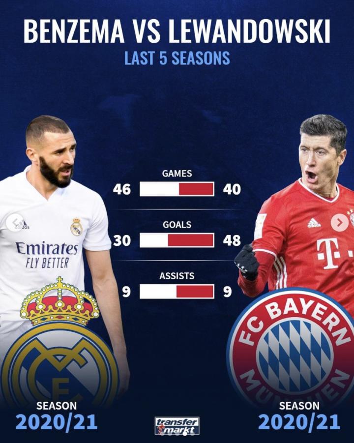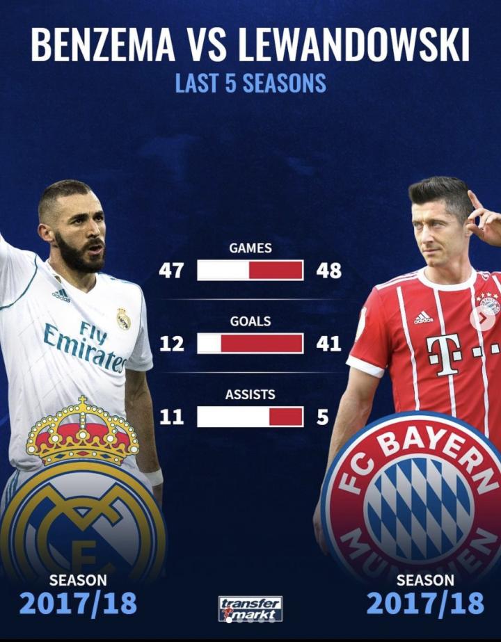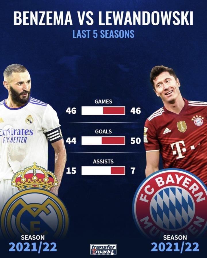德转对比本泽马&莱万近5年数据:本泽马143球,莱万234球