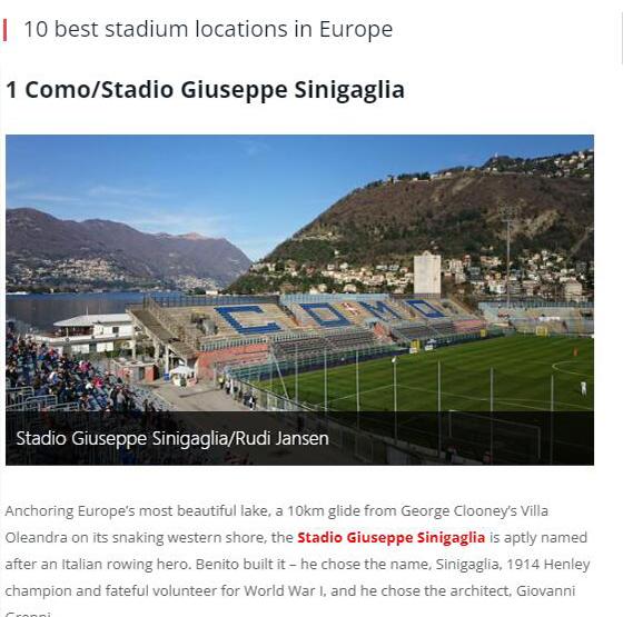 但从另外一个角度来说,正是这些“不完美”给了这座球场“完美”。在欧洲媒体评选的“欧洲十大最美球场中”,朱塞佩-西尼加利亚球场排名第一。得益于近些年来的宣传,不少球迷甚至专程在比赛日来到科莫,只为一堵传言中朱塞佩-西尼加利亚球场那迷人的风景。