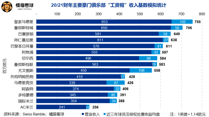 根据财务专家Swiss Ramble统计,20/21财年数据以上述口径计算可得,主流豪门中收入总和最高的是上赛季西甲和欧冠双料冠军皇家马德里,因此也将拥有全欧最高的工资帽。