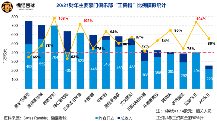 这个数据并不容易从外部获得,从少数俱乐部财报披露的细节信息计算,球员和教练工资大体占俱乐部总工资薪金支出的90%左右。