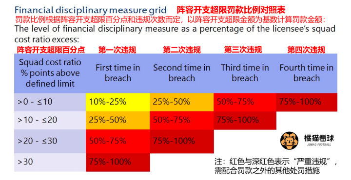 对违规俱乐部的处罚也更加透明,欧足联事先针对不同程度的工资帽超限情况制定了相应罚款标准。例如对于“初犯”且超限10个百分点以内的俱乐部,罚款为超限金额的10%-25%,从欧战奖金中扣除。