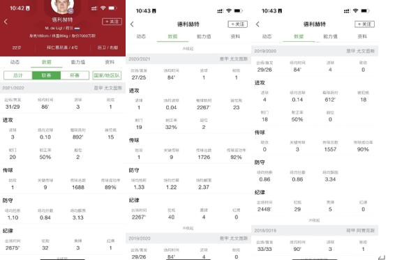 通过对特里赫特在尤文的近三个赛季的技术统计(如下图)可知,德里赫特的各项防守技术指标都较高,场均抢断、场均拦截均达到了0.8次以上,这数据略高于范戴克、鲁本迪亚斯,也说明了特里赫特很喜欢上抢,喜欢上身体,且抢断准确性比较高。场均第一、第三赛季达到了3次以上,这也到了范戴克、鲁本迪亚斯等顶级中后卫的防守水准啦!