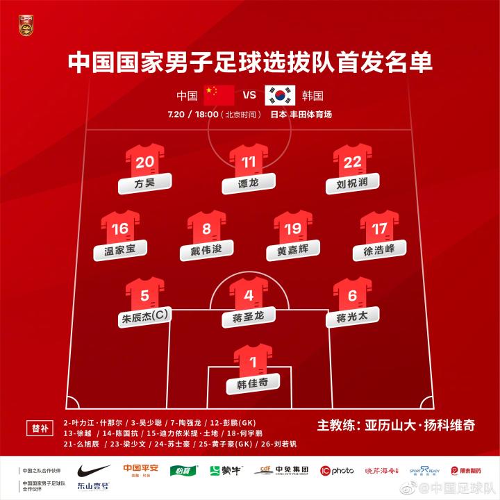 北京时间7月20日,国足选拔队迎来东亚杯首场较量,对手是韩国队。在国足官方公布的首发阵容中我们可以看到,这场国足是3-4-3阵型,方昊、谭龙、刘祝润都是前锋位,而谭龙将担任中锋。