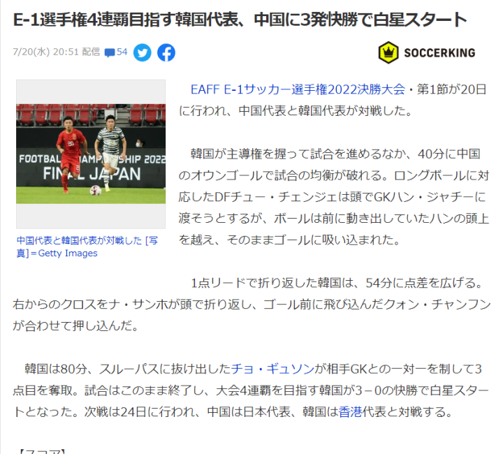 日本雅虎体育发表文章:《韩国三球大胜中国开启冠军之旅》