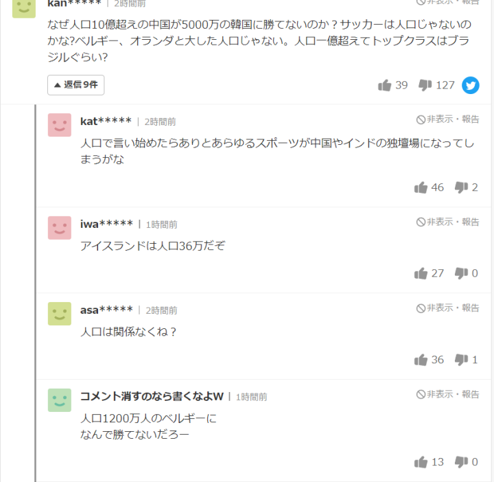 kan*****:为什么人口超过10亿的中国战胜不了人口超过5000万的韩国?足球不是人口吗?比利时、荷兰,人口不算多。人口超过一亿的顶级国家只有巴西吗?