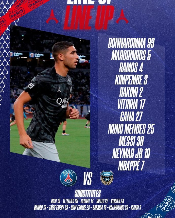 球队在中场休息换下姆巴佩,内马尔,门德斯,阿什拉夫,金彭贝;换上贝尔纳特,萨拉维亚,埃宾贝,卡利姆恩多,迪亚洛。