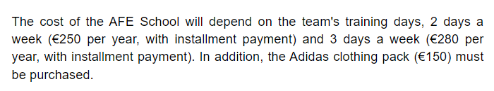 公益性质,极其低廉的学费让更多普通家庭的孩子能够走上足球之路。该机构的官网称,每周两训,年费250欧元,内格雷多在AFE呆了四年,16岁(2001)被职业俱乐部相中,加盟巴列卡诺。日后,内格雷多经常光顾这家让他生根发芽,提供充足养分的俱乐部,给下一代足球学子们关照,指导,他和卡马乔甚至担任过学校的负责人。