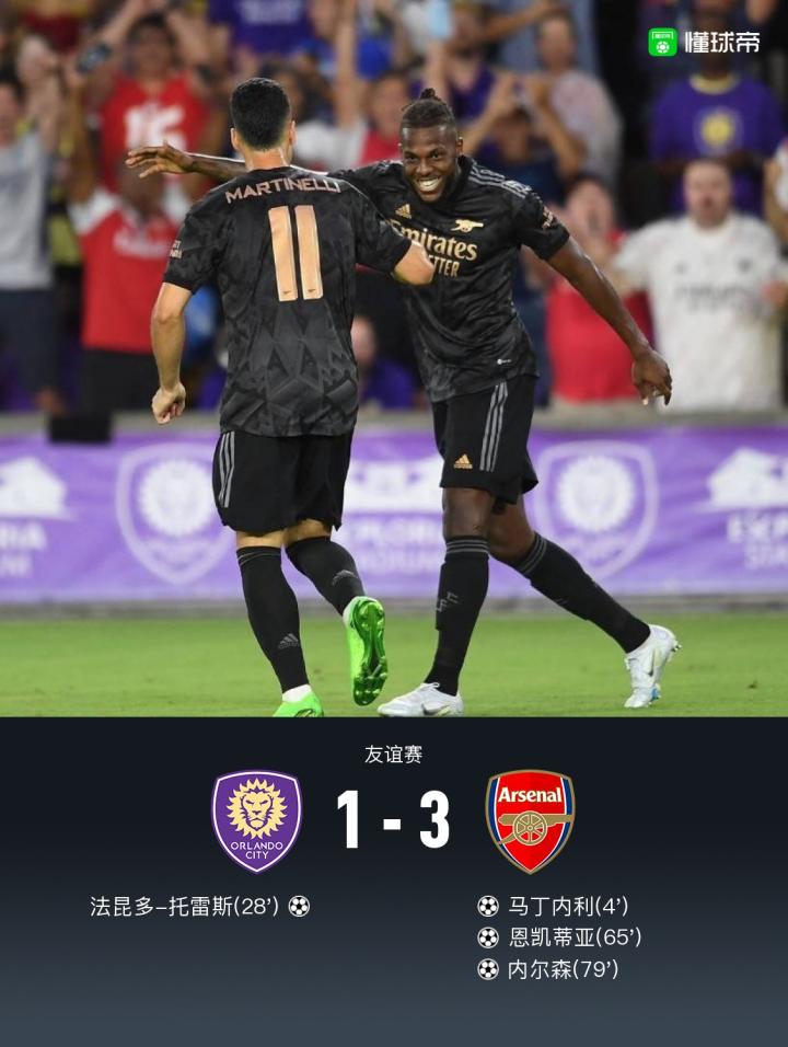 【阿森纳3-1奥兰多城,马丁内利闪击,恩凯蒂亚、内尔森破门】