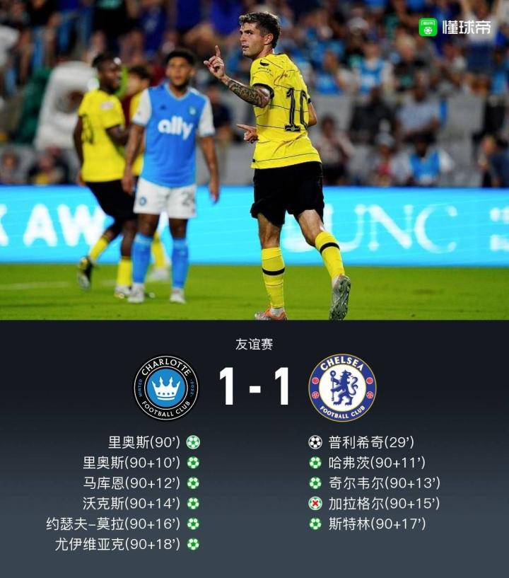 【切尔西总比分4-6夏洛特FC,普利希奇破门,加拉格尔失点】