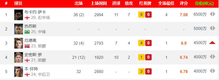 英格兰国脚本怀特目前身价4,000万欧元,在阿森纳队内身价排行榜上排名第五。