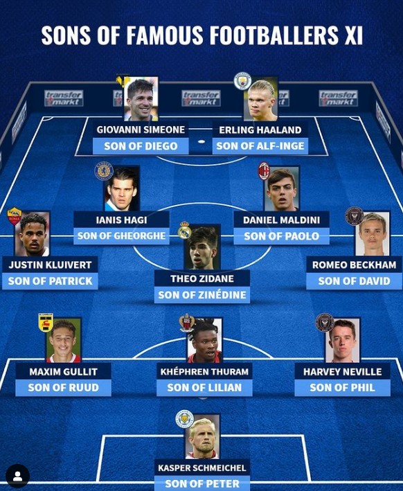 当今足坛有很多球员子承父业,父亲也都是足球运动员。德国知名足球数据网站“转会市场”评选出了当今足坛的星二代最佳阵容,哈兰德领衔,小舒梅切尔和特奥-齐达内在列。期待这套阵容和父辈们踢一场吗?