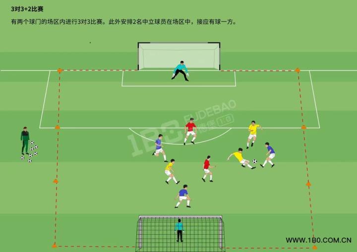 我们可以从最基本的“面”开始练习,即最简单的3v1或者4v2抢圈练习。