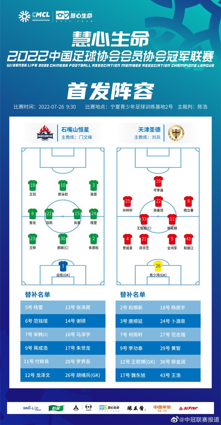 石嘴山恒星主帅门文峰安排郝爽担任队长,白烁司职门将,郭泳初、冯阳、訾龙等球员首发出战。天津圣德主教练刘兵安排王俊超担任队长领衔出战,胡茗赫、岑李逸、张善羽、杨立春等球员同时首发。