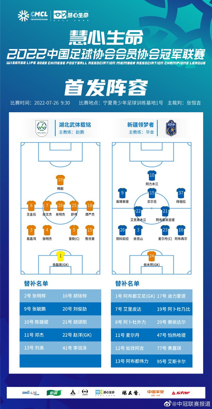 首发阵容方面,湖北武体载铭主帅赵鹏安排曾新担任队长,岳磊雨司职门将,尚文杰、肖明杰、韩毅等球员首发登场。新疆领梦者主教练华金安排麦尔丹担任场上队长,依木然出任门将,阿力木江、买尔旦、库得来提等球员首发亮相。