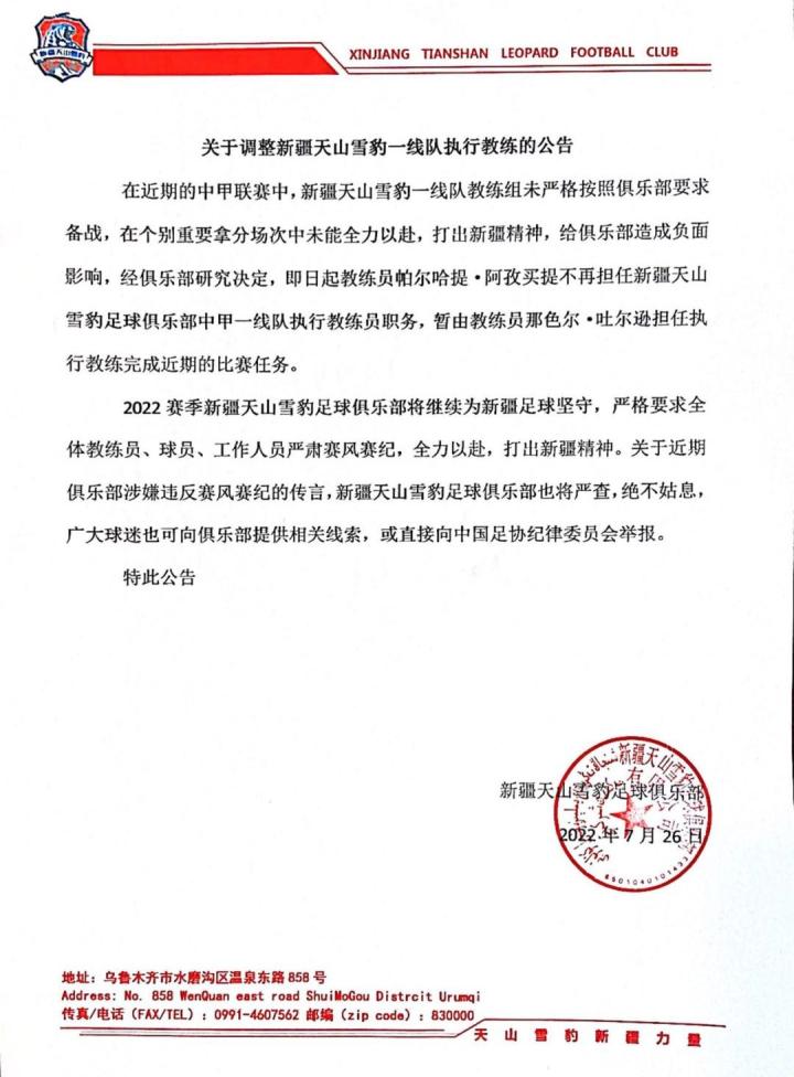 北京时间7月26日,新疆天山雪豹足球俱乐部发布官方公告,因在个别重要拿分场次中未能全力以赴,即日起教练员帕尔哈提-阿孜买提不再担任新疆天山雪豹足球俱乐部中甲一线队执行教练员职务。