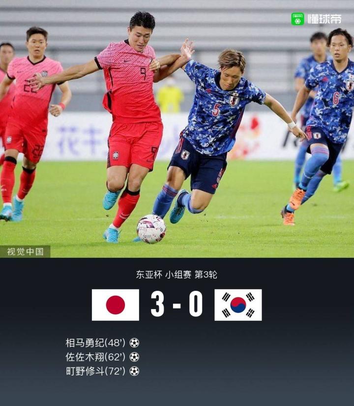 北京时间7月27日18:20,东亚杯小组赛第3轮暨冠军争夺战打响,日本对阵韩国。赛前日本队一名球员新冠检测阳性,而本场比赛后卫山根视来没有进入名单。半场结束,日本在进攻方面更具威胁,町野修斗开场远射造险,相马勇纪小角度射门中柱,赵贤祐多次贡献扑救;下半场,相马勇纪头槌打破僵局,佐佐木翔、町野修斗7分钟内连入两球,替补登场的宫市亮伤退,最终日本3-0韩国,获得东亚杯冠军。